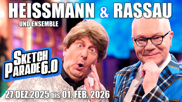 Ab 27. Dezember 2025 bis 01. Februar 2026 bringen Heißmann & Rassau in ihrem heimischen Wohnzimmer die Zuschauer wie gewohnt zum Lachen – mit einer total aufpolierten Version „6.0“ ihres LIVE-Programmes „Sketchparade“. Wie schon in allen vorherigen fünf Versionen haben die beiden mehr als nur einen Schalk im Nacken, die zwei urigen Spaßvögel trotzen den gegenwärtigen Herausforderungen und die Fans erleben Frankens beliebtestes Komödianten-Duo in einer rasanten Revue voller urkomischer Begegnungen und absurder Begebenheiten. Und sie sind bekanntermaßen stets in der Lage, immer wieder noch eins draufzusetzen!